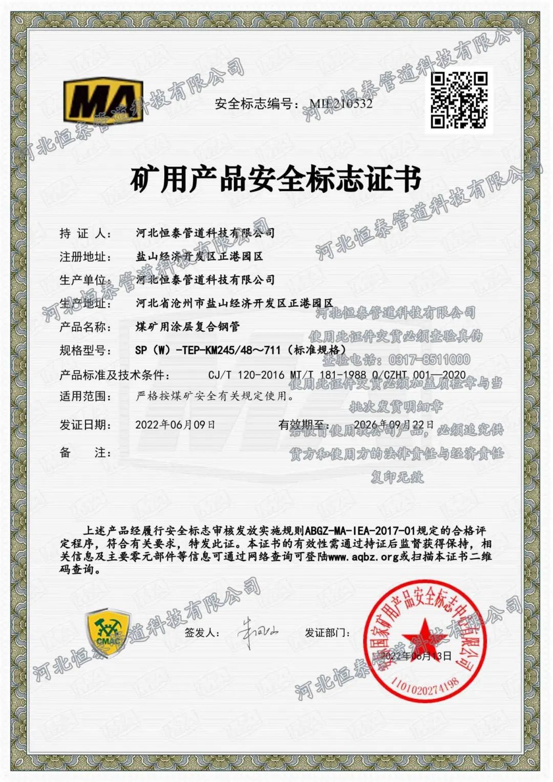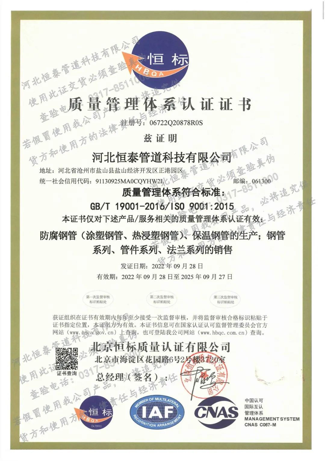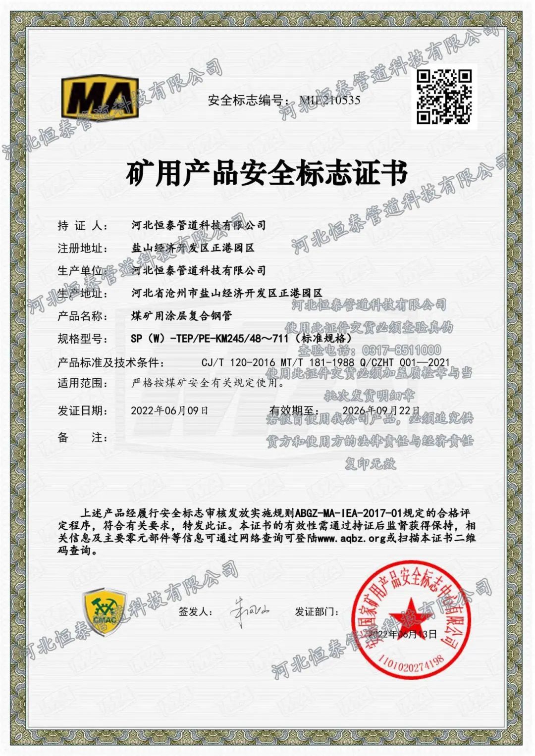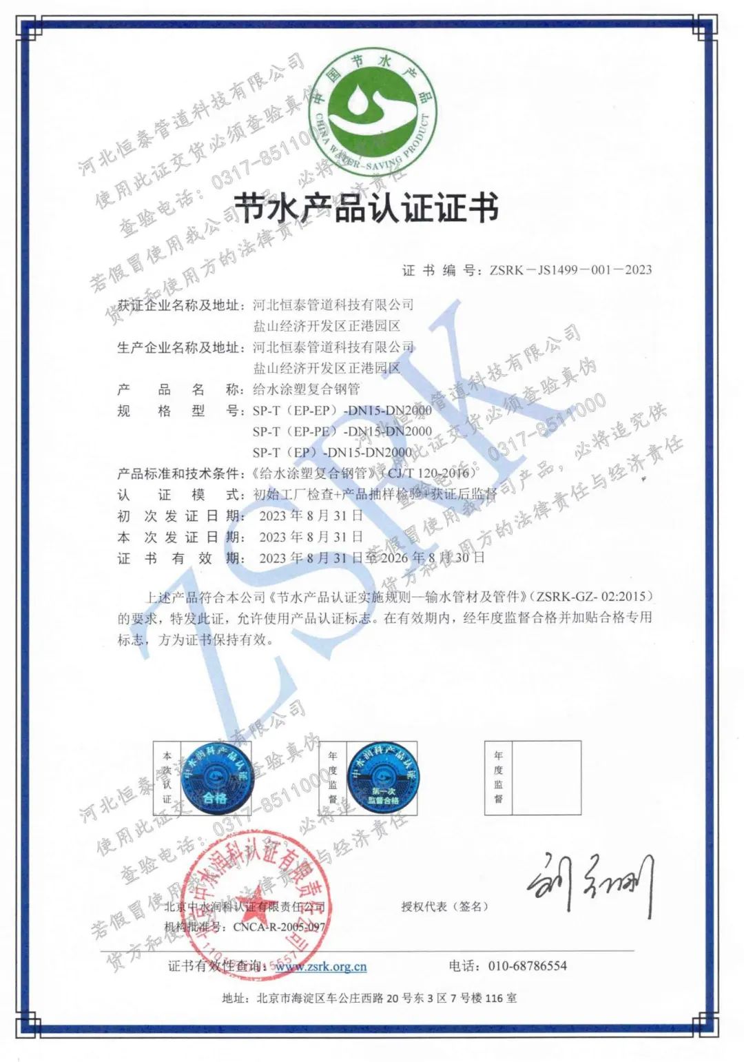 河北恒泰管道科技有限公司从产品设计、生产、销售到服务的全方位支持,满足客户的多样化需求。公司经营目标:“为祖国的管道事业贡献力量”! 公司拥有国家特种设备制造许可证、河北省国产涉及饮用水卫生安全产品-卫生许可批件(5个证)、矿用产品安全标志证书(4个证)、ISO9001质量管理体系认证证书、ISO14001环境管理体系认证证书、ISO45001职业健康安全管理体系认证证书、安全生产许可证、节水产品认证证书(中水润科认证);已取得河北省科技型中小企业证书、河北省创新型中小企业证书、河北省工业企业研发机构证书、AAA 企业信用证书等;是中国工商业联合会、河北省管道装备制造行业协会、河北省防腐保温行业协会、盐山县管道装备制造业协会等多家协会会员单位。 ![]() ![]() ![]() ![]() ![]() ![]() ![]() ![]() ![]() ![]() ![]() ![]() ![]() ![]() 涂塑钢管拥有优良的电气绝缘性、吸水率低、无毒卫生、外观美观等特点,能够适应埋地和潮湿环境,耐高温和低温。这些特点使得涂塑钢管被广泛应用于建筑给排水、消防喷淋、输气输水、化工防腐、电力穿线等众多领域。 防腐钢管防腐性能优越,有效防止钢管腐蚀, 延长钢管使用寿命,降低维护成本。钢管强度大,承压能力高。表面光滑,流体阻力小。适用于各种恶劣环境,如潮湿、酸碱等。 内外涂塑钢管、涂塑管件DN15-DN3600 ①:内外环氧粉末(EP)涂塑钢管、管件 ②:外聚乙烯(PE)内环氧粉末(EP)涂塑钢管、管件 ③:单、双层熔结环氧粉末防腐钢管、管件 标准:GB/T28897-2021、CJ/T120-2016、SY/T0442-2018、SY/T0315-2013 大口径3PE防腐钢管DN200-DN3600 ①:外3PE防腐钢管 ②:TPEP防腐钢管(外3PE内EP) 标准:GB/T23257-2017、GB/T28897-2021、CJ/T120-2016、SY/T0442-2018 ![]() ![]() ![]() 热浸塑钢管(电缆穿线管) DN50(60mm) DN65(76mm) DN80(89mm) DN100(100mm) DN125(140mm) DN150(165mm) DN175(180mm) DN200(219mm) 标准:DL/T802.10-2019、GB/T28897-2021 另加工: 亮点 中铁四局衢州地下管网建设工程项目 黄河养护集团洪湖市西部中心水厂新建工程 四川蒙城涡北污水处理项目 青海同德尕干水库配套灌溉工程 中交二航京杭运河浙江段三级航道整治工程 湖南桂东城乡给排水设施建设项目 ... ...