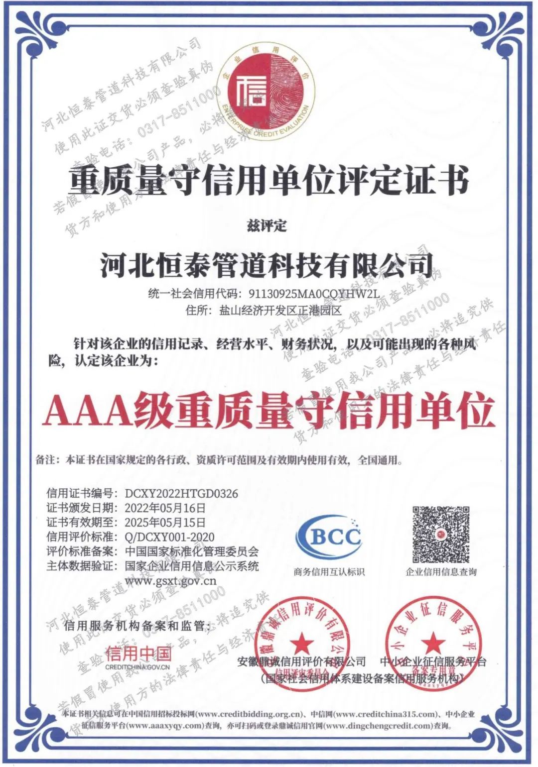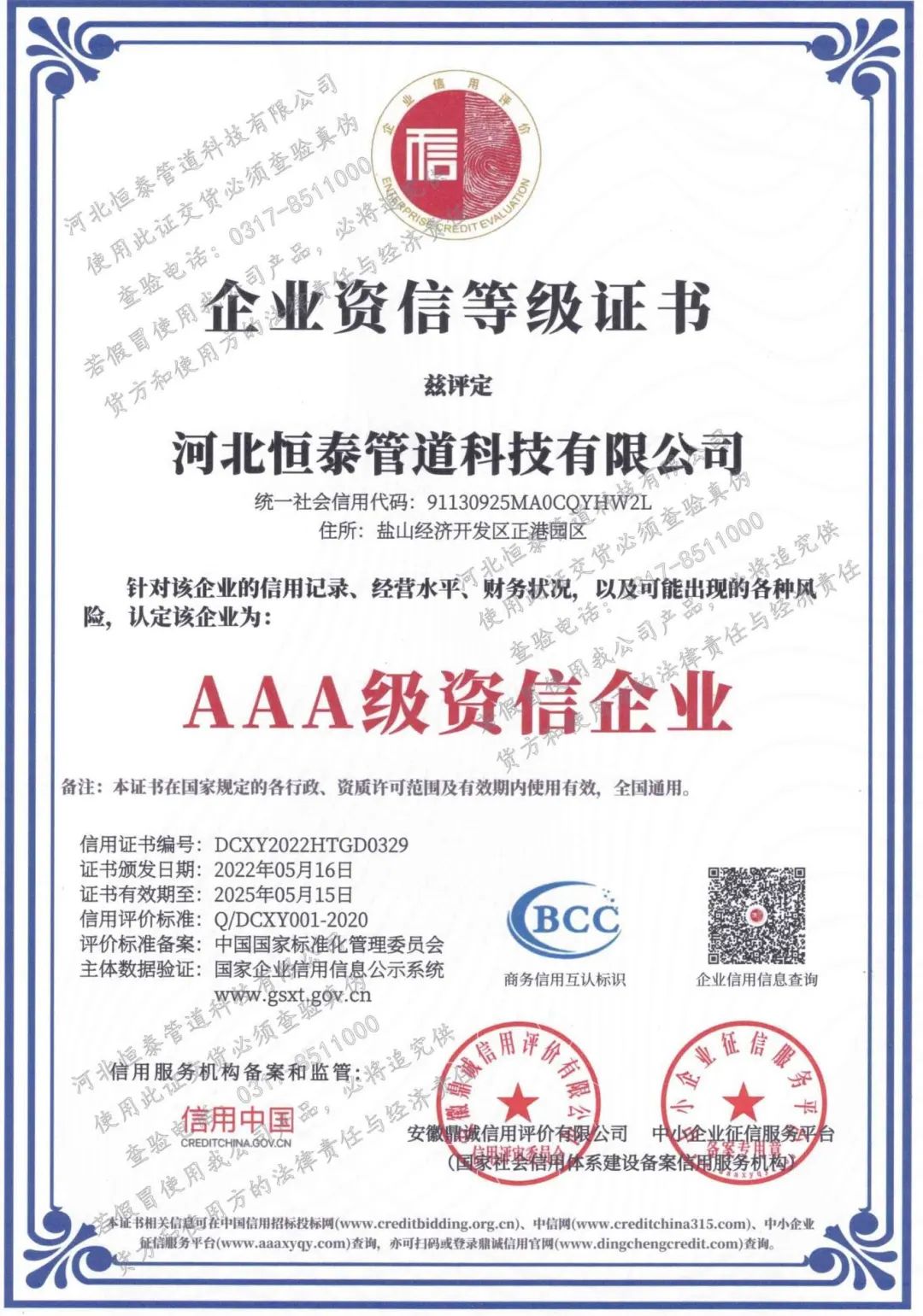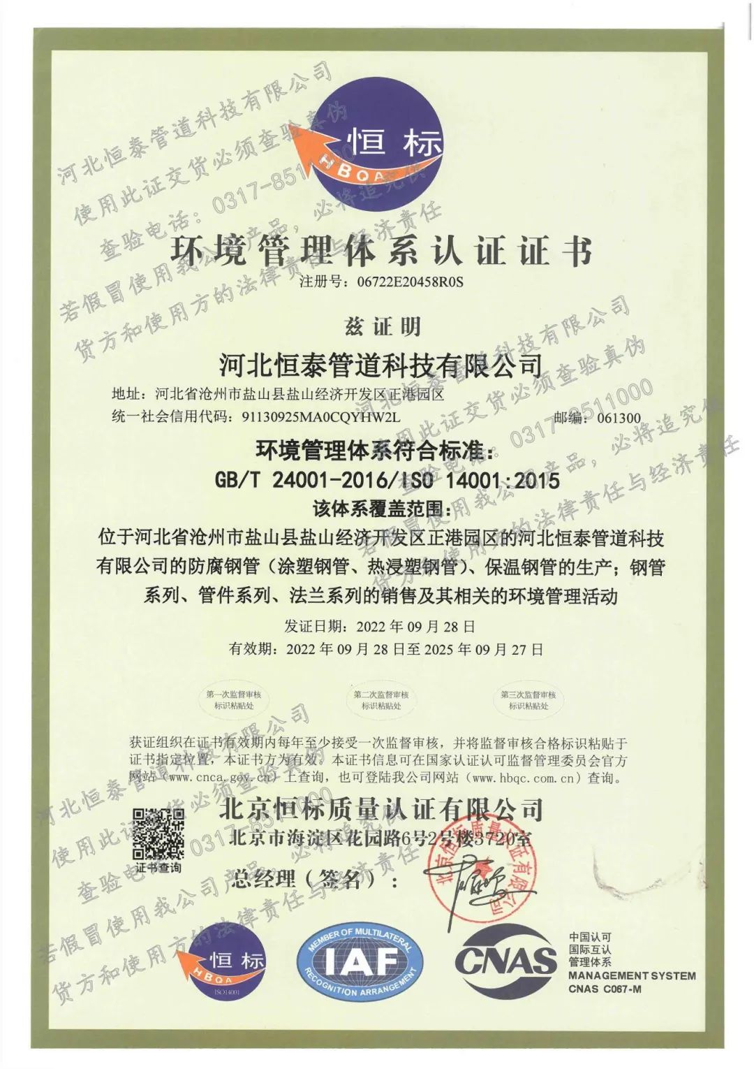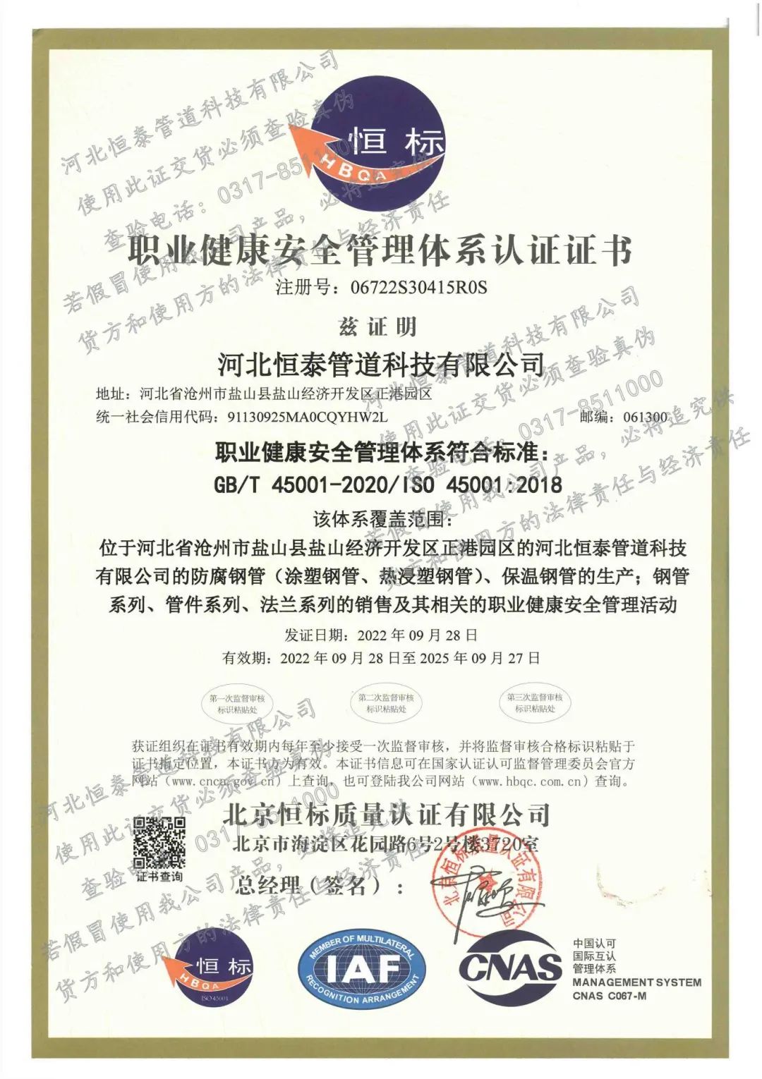 河北恒泰管道科技有限公司从产品设计、生产、销售到服务的全方位支持,满足客户的多样化需求。公司经营目标:“为祖国的管道事业贡献力量”! 公司拥有国家特种设备制造许可证、河北省国产涉及饮用水卫生安全产品-卫生许可批件(5个证)、矿用产品安全标志证书(4个证)、ISO9001质量管理体系认证证书、ISO14001环境管理体系认证证书、ISO45001职业健康安全管理体系认证证书、安全生产许可证、节水产品认证证书(中水润科认证);已取得河北省科技型中小企业证书、河北省创新型中小企业证书、河北省工业企业研发机构证书、AAA 企业信用证书等;是中国工商业联合会、河北省管道装备制造行业协会、河北省防腐保温行业协会、盐山县管道装备制造业协会等多家协会会员单位。 ![]() ![]() ![]() ![]() ![]() ![]() ![]() ![]() ![]() ![]() ![]() ![]() ![]() ![]() 涂塑钢管拥有优良的电气绝缘性、吸水率低、无毒卫生、外观美观等特点,能够适应埋地和潮湿环境,耐高温和低温。这些特点使得涂塑钢管被广泛应用于建筑给排水、消防喷淋、输气输水、化工防腐、电力穿线等众多领域。 防腐钢管防腐性能优越,有效防止钢管腐蚀, 延长钢管使用寿命,降低维护成本。钢管强度大,承压能力高。表面光滑,流体阻力小。适用于各种恶劣环境,如潮湿、酸碱等。 内外涂塑钢管、涂塑管件DN15-DN3600 ①:内外环氧粉末(EP)涂塑钢管、管件 ②:外聚乙烯(PE)内环氧粉末(EP)涂塑钢管、管件 ③:单、双层熔结环氧粉末防腐钢管、管件 标准:GB/T28897-2021、CJ/T120-2016、SY/T0442-2018、SY/T0315-2013 大口径3PE防腐钢管DN200-DN3600 ①:外3PE防腐钢管 ②:TPEP防腐钢管(外3PE内EP) 标准:GB/T23257-2017、GB/T28897-2021、CJ/T120-2016、SY/T0442-2018 ![]() ![]() ![]() 热浸塑钢管(电缆穿线管) DN50(60mm) DN65(76mm) DN80(89mm) DN100(100mm) DN125(140mm) DN150(165mm) DN175(180mm) DN200(219mm) 标准:DL/T802.10-2019、GB/T28897-2021 另加工: 亮点 中铁四局衢州地下管网建设工程项目 黄河养护集团洪湖市西部中心水厂新建工程 四川蒙城涡北污水处理项目 青海同德尕干水库配套灌溉工程 中交二航京杭运河浙江段三级航道整治工程 湖南桂东城乡给排水设施建设项目 ... ...