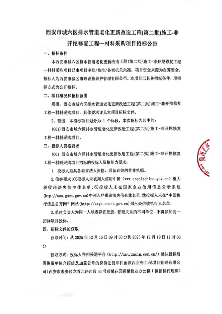 招标公告 | 西安市城六区排水管道老化更新改造工程(第二批)施工-非开挖修复工程—材料采购项目