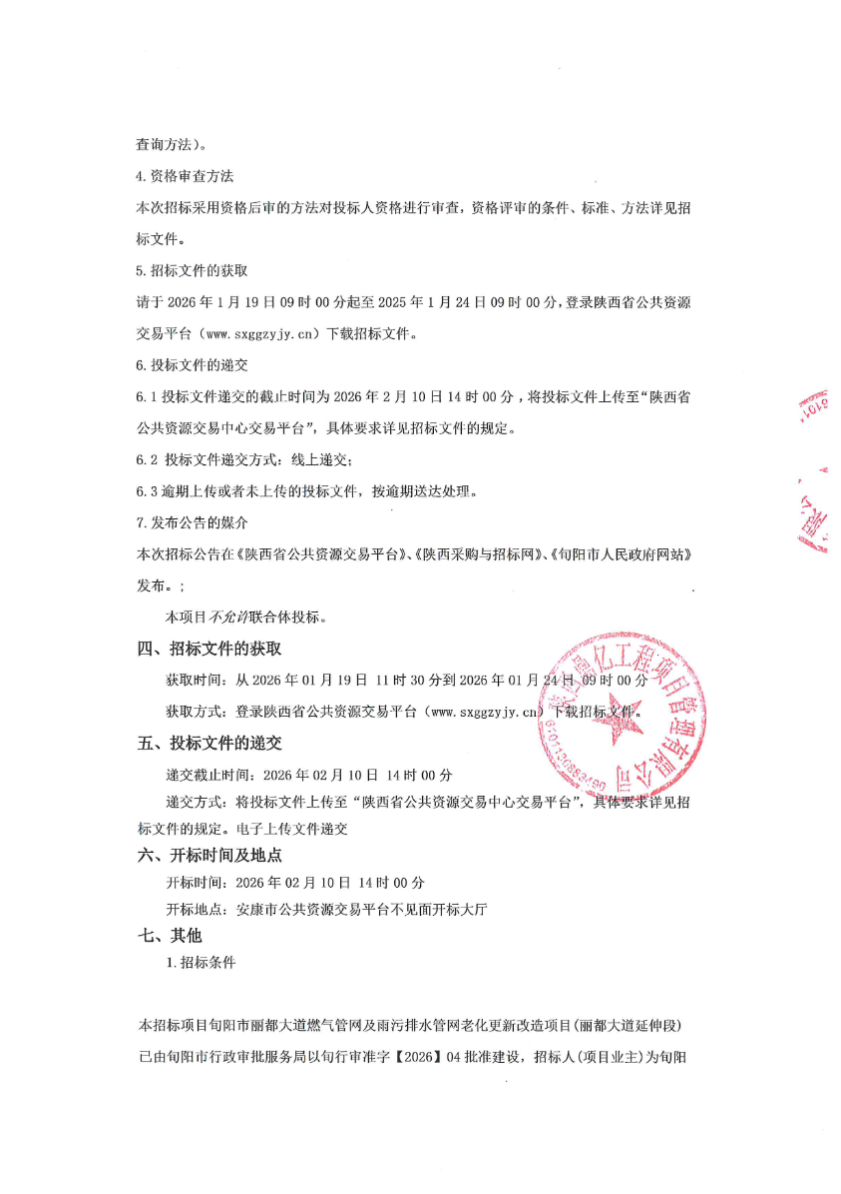 旬阳市丽都大道燃气管网及雨污排水管网老化更新改造项目(丽都大道延伸段)招标公告